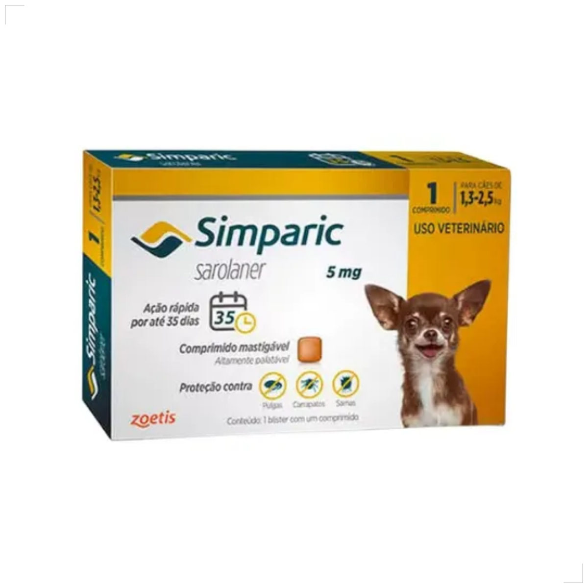 Zoetis Simparic 5 mg para Cães 1,3 a 2,5Kg 1 comprimido pulgas e carrapatos